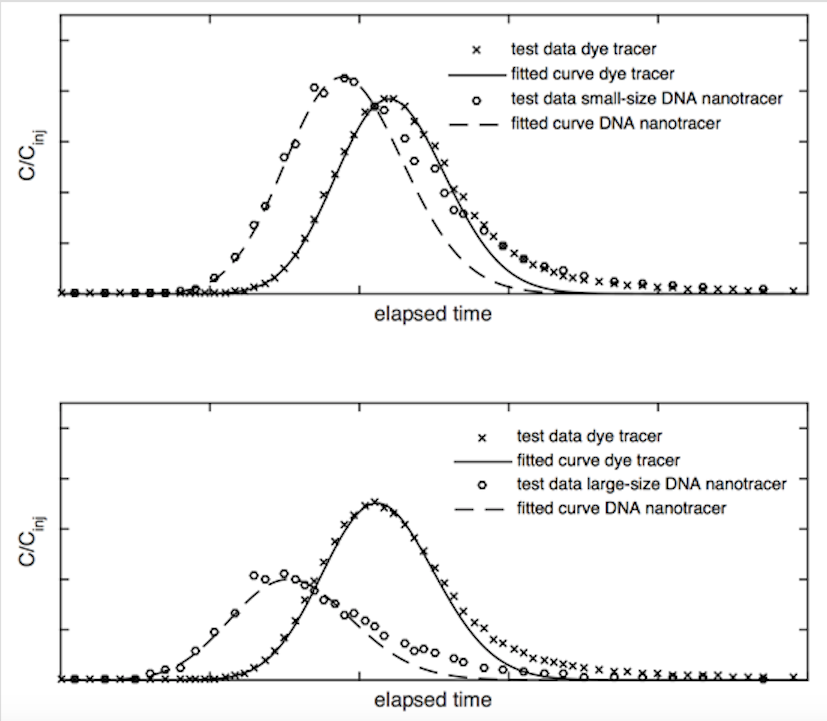 In this study, breakthrough curves of the DNA nanotracer and of the simultaneously injected dye tracer are analyzed and mathematically modeled. Specific modification of size and surface charge of the DNA nanotracer allows conducting experiments that demonstrate transport processes according to the particle properties. First results of the DNA nanotracer breakthrough curves indicate a similar transport behavior as it is commonly observed for colloids.