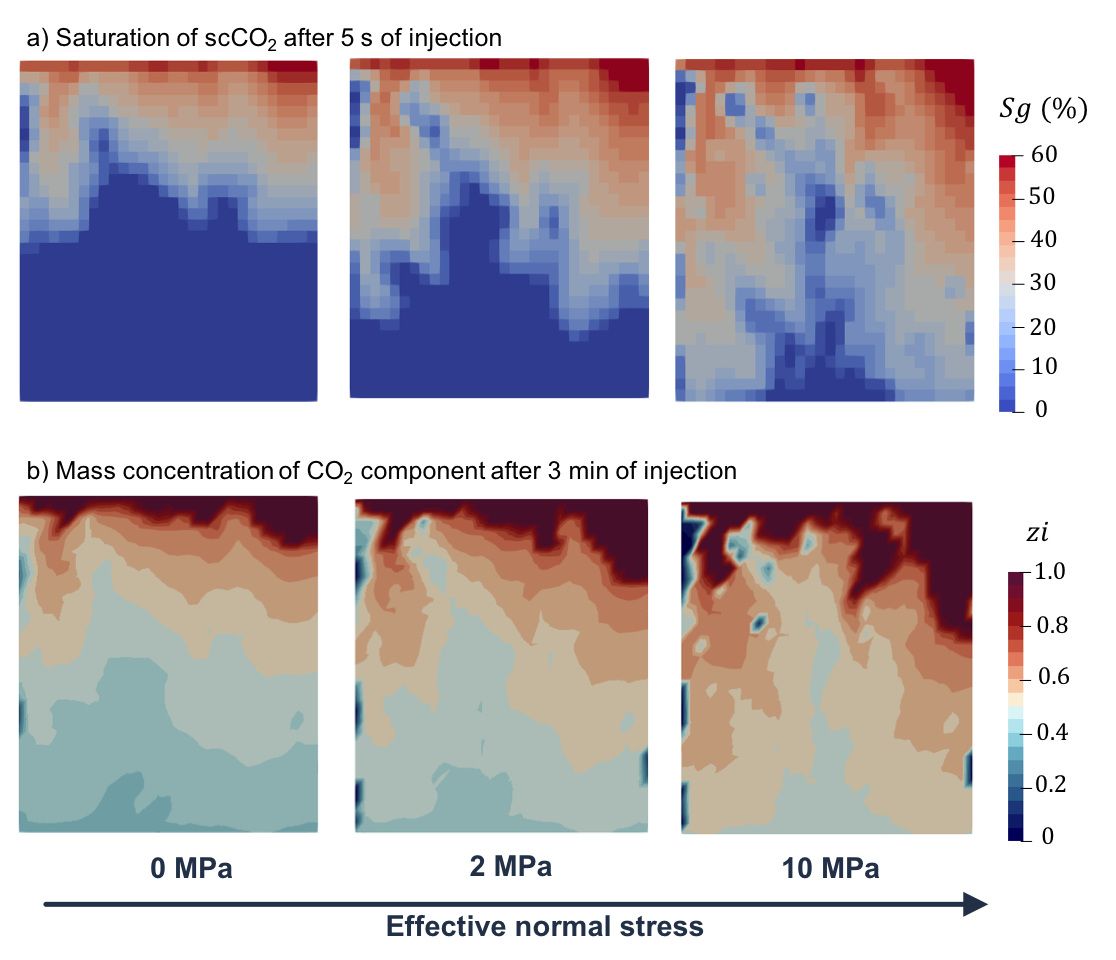 The proposed study would investigate precisely the above-described mechanisms in laboratory experiments. Specifically, we will investigate salt precipitation in natural and/or artificial fractures in granite, in order to understand the mechanisms that govern porosity and permeability changes that result from such pore-space modifications due to salt precipitation. By employing reactive flow-through experiments within an X-ray transparent pressure vessel, we can register the depositional patterns of precipitated salt after long-term flooding of dry, supercritical CO2 into brine-saturated fractured granite cores using X-Ray Computed Tomography. We will determine the porosity/permeability of the fractured granite cores before and after these experiments using a transient pressure-decay method. We may also quantify precipitation of salt with a Scanning Electron Microscope. Four control parameters will be investigated: 1) initial brine salinity, 2) effective stress, 3) CO2 flooding rate, and 4) fracture and pore-space geometry. These experimental observations will serve as calibration examples for the development of a numerical fluid flow and fluid-mineral reaction simulator, a critical step towards simulating and understanding the long-term behavior of geologic reservoirs.