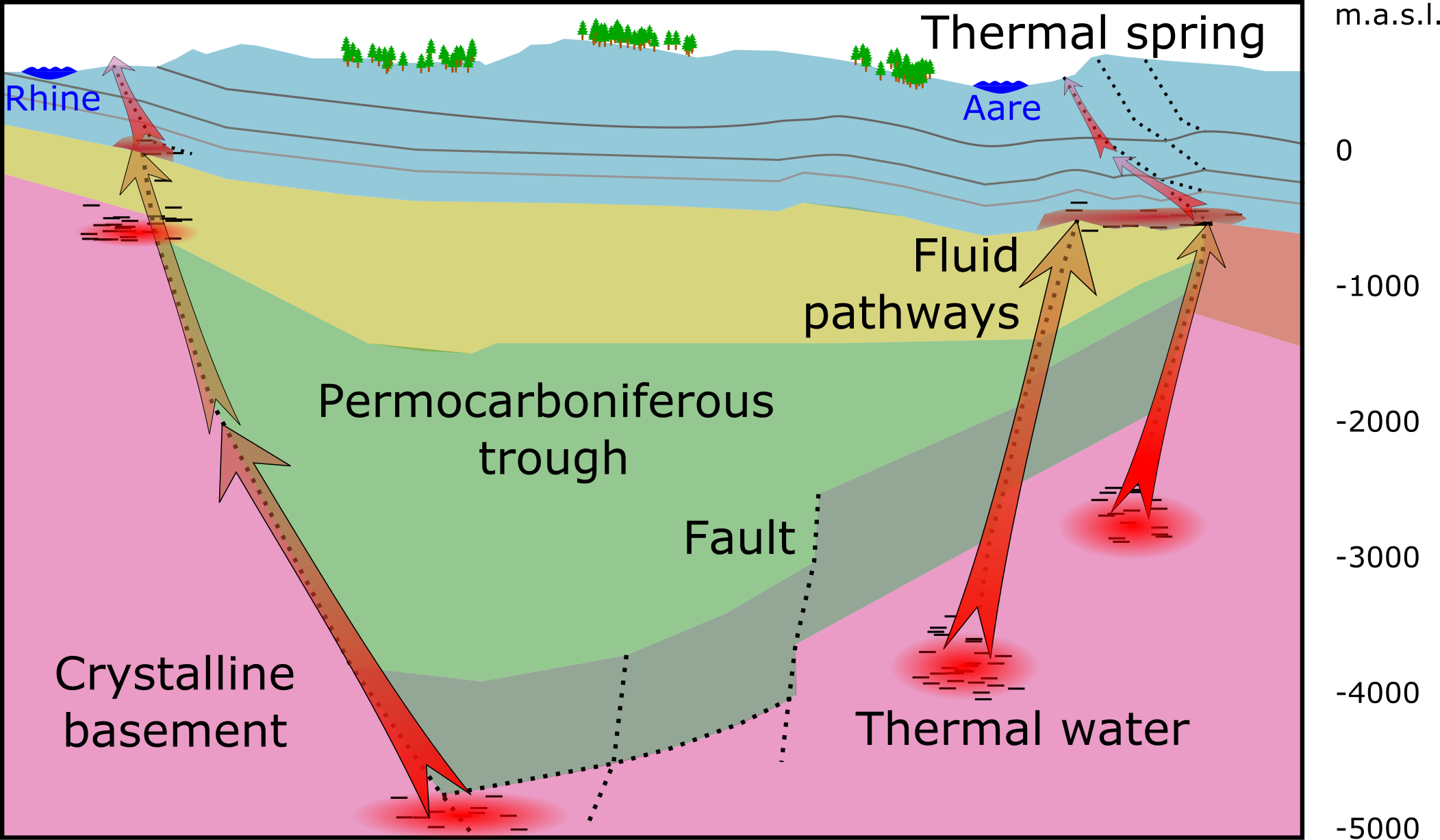Electrically conductive layers in the crust typically represent mechanically weak zones such as faults and porous rock layers that act as permeable pathways for fluids and thermal aquifers. An electrical conductivity model of the subsurface in the Aargau region would thereby provide insight into the extent of the permo-carboniferous trough at depth and contribute to a better understanding of the deep sources of thermal springs at the surface.
